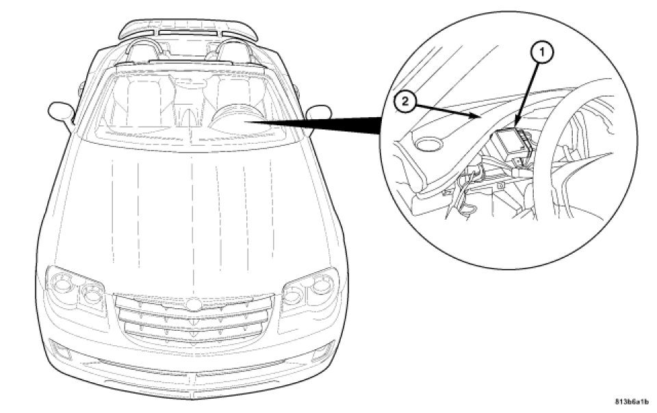 The Sentry Key Remote Entry Module (SKREEM) (1) is located underneath the top pad of the instrument panel (2) behind the Instrument Cluster. The SKREEM works in conjunction with the vehicle locking/unlocking remote control and the Central Locking Pump/Security System Module to lock and unlock the vehicle.