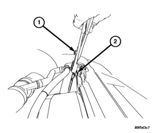 5. Route the coolant return hose (1) through the bracket (2) on the radiator fan.
