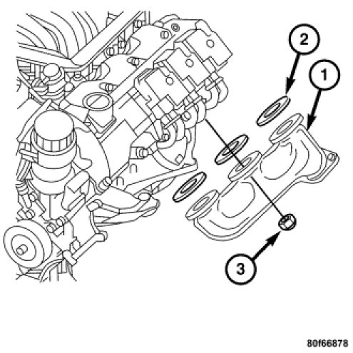 1. Position the manifold (1) and gaskets (2) on the cylinder head. Install the manifold nuts (3) and tighten to 35 Nm (26 ft. lbs.).