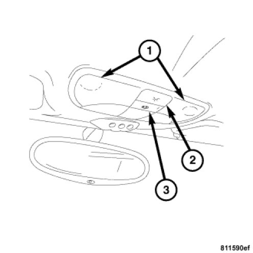 The courtesy lamps (1) provide overhead interior illumination when the doors are opened and the courtesy lamp defeat switch (3) is in the "-" position, or when the courtesy lamp switch (2) is pressed. The courtesy lamp defeat switch (3) can prevent the courtesy lamps operation when the doors are opened if the "O" position is selected. The courtesy lamp switch/unit cannot be adjusted or repaired. If faulty, worn, or damaged, the entire assembly must be replaced. For complete courtesy lamp switch/unit removal procedures, refer to Courtesy Lamp Switch/Unit removal.