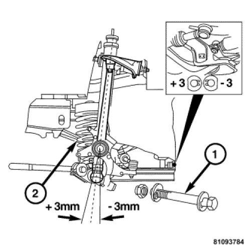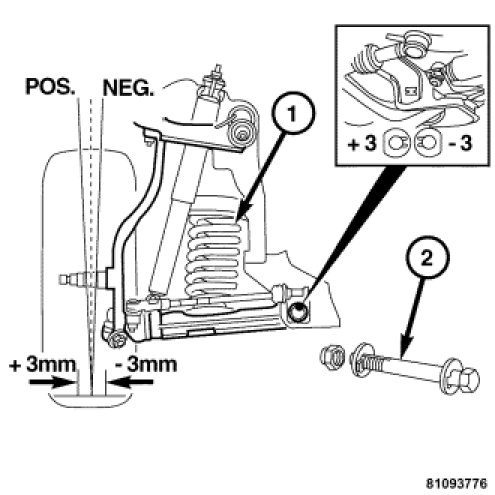 Camber is the inward or outward tilt of the wheel relative to the center of the vehicle. Tilting the top of the wheel inward provides negative camber (NEG.). Tilting the top of the wheel outward provides positive camber (POS.). Incorrect camber will cause wear on the inside or outside edge of the tire. (1) Indicates the spring location. (2) Is the eccentric repair bolt for adjusting camber.