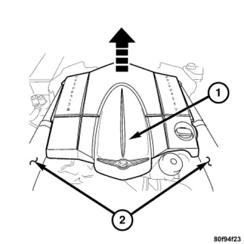 5. Install the engine cover (1). Align the engine cover retaining clips to the rubber mounts, and push down firmly to connect engine cover to rubber mounts.