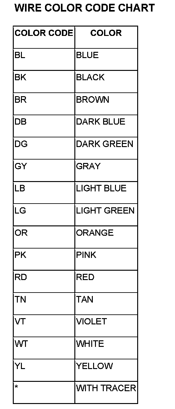 Each wire shown in the diagrams contains a code which identifies gage of wire, and color.