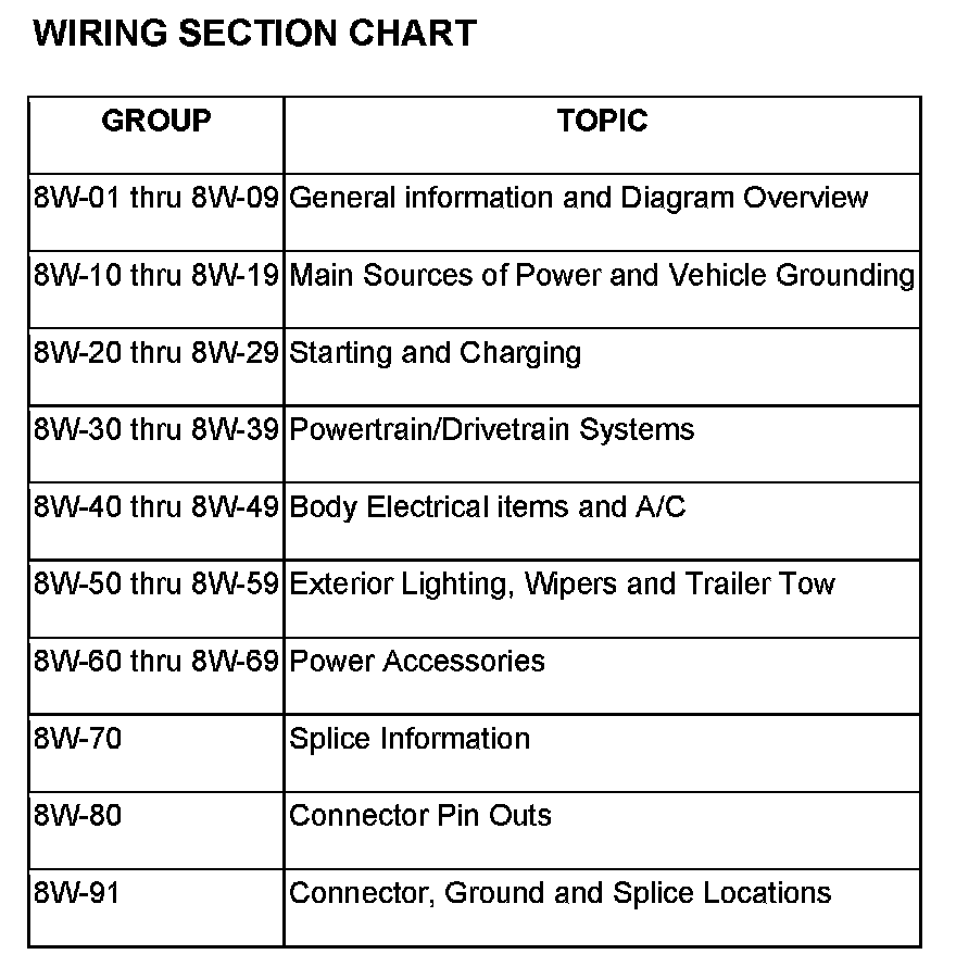The wiring diagrams are grouped into individual sections. If a component is most likely found in a particular group, it will be shown complete (all wires, connectors, and pins) within that group. For example, the Auto Shutdown Relay is most likely to be found in Powertrain Management, so it is shown there complete. It can, however, be shown partially in another group if it contains some associated wiring.