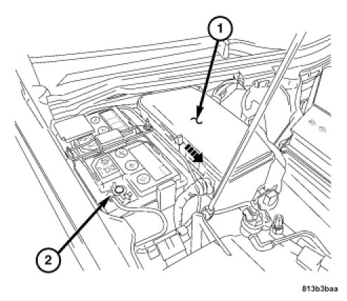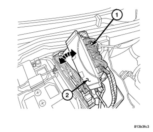3. Holding the metal powertrain control module retaining clip (1) back, pull the powertrain control module up and out of the control module box.