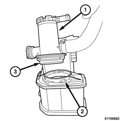 1. Install the charcoal canister shutoff valve (1) to EVAP canister (2) using new O-ring (3).