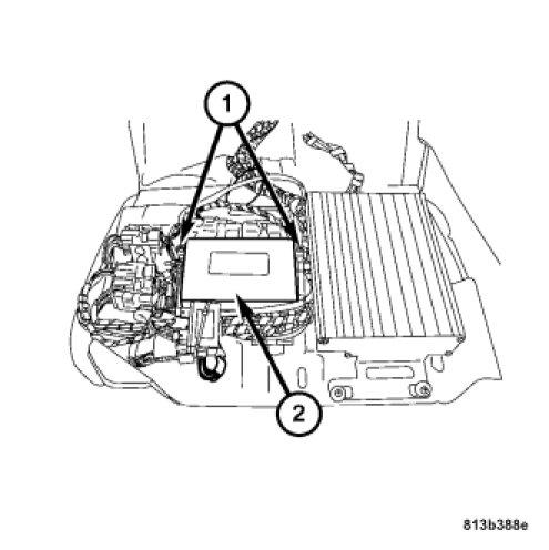 1. Connect the TCM harness connectors and attach the TCM (2) to the base plate with the two retaining screws (1).