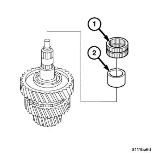 6. Remove first gear needle bearing (1) and sleeve (2).