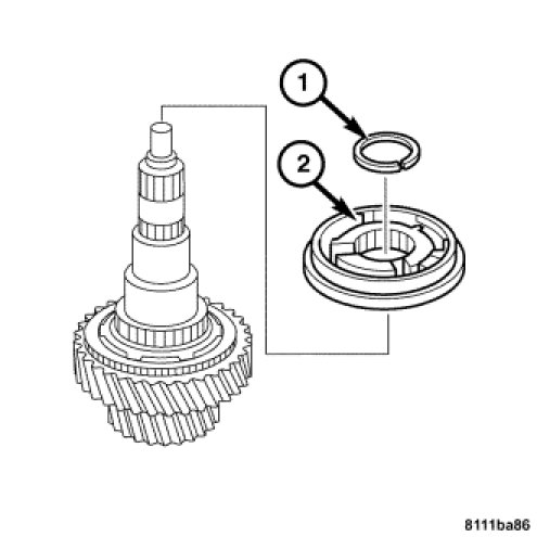 5. Remove the synchronizer ring (1) and idler gear (2) for reverse gear.
