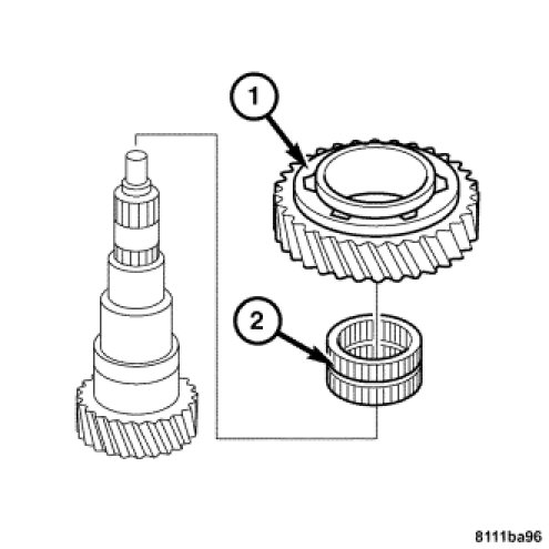 11. Remove the second gear idler gear (1) and needle bearing (2).