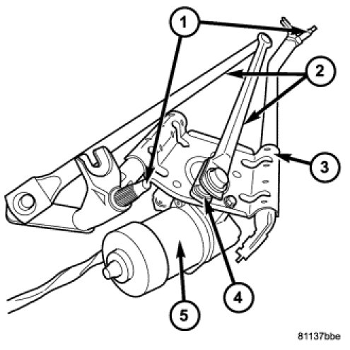 The Wiper Module holds the wiper motor and is secured with two nuts on studs and one bolt, each through rubber isolators to the cowl plenum panel. The ends of the two wiper pivot shafts that protrude through openings in the cowl grille panel and drive the wiper arms are the only visible components of the wiper module on the exterior of the vehicle. The Wiper Module consists of the following major components: