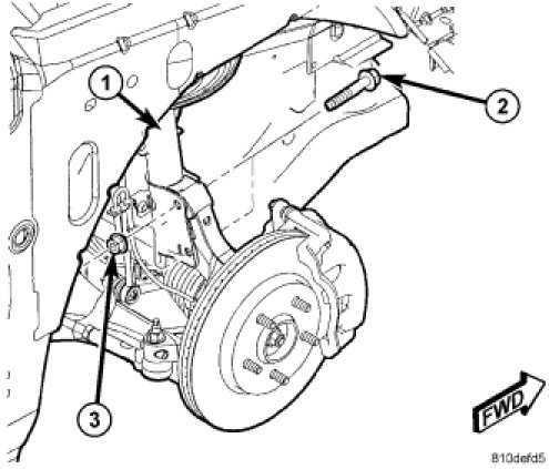 NOTE: The strut clevis-to-knuckle bolts are installed differently on each side. Left hand side bolts are to be installed from vehicle rear to front. Right side bolts are to be installed from vehicle front to rear.