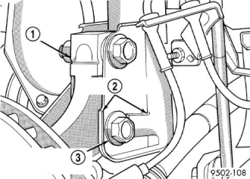 a. While holding bolt heads stationary, remove two nuts (3) from bolts (2) attaching strut (1) to knuckle.
