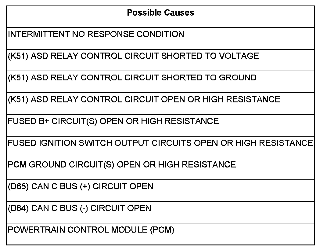 - Repair the (K51) ASD Relay Control circuit for a short to voltage.