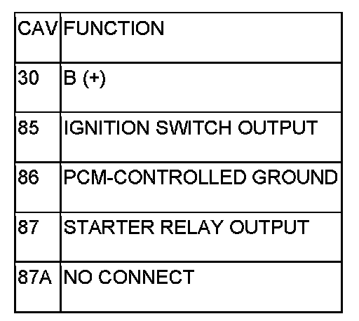 5. The coil ground terminal (86) is connected to the electromagnet in the relay. It is grounded by the PCM if the conditions are right to start the car. For automatic trans. cars the PCM must see Park Neutral switch low and near zero engine speed (rpm). For manual trans. cars the PCM only needs to see near zero engine speed (rpm) and low clutch interlock input and see near zero engine speed (rpm). To diagnose the Park Neutral switch of the trans range sensor refer to the transaxle section. Check for continuity to ground while the ignition switch is in the start position and if equipped the clutch pedal depressed. If not OK and the vehicle has an automatic trans. verify Park Neutral switch operation. If that checks OK check for continuity between PCM and the terminal 86. Repair open circuit as required. Also check the clutch interlock switch operation if equipped with a manual transmission. If OK, the PCM may be defective.