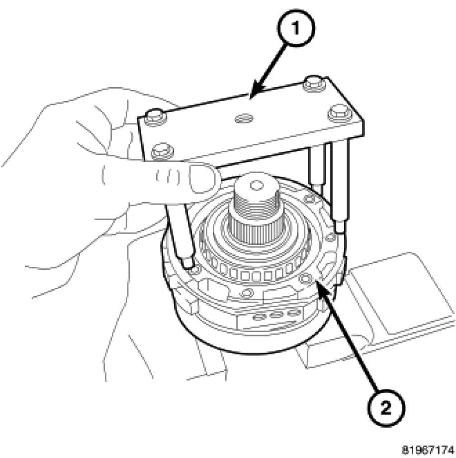 24. Install compressor 8250 (2) over the direct clutch balance piston (3) and place onto a press (1).