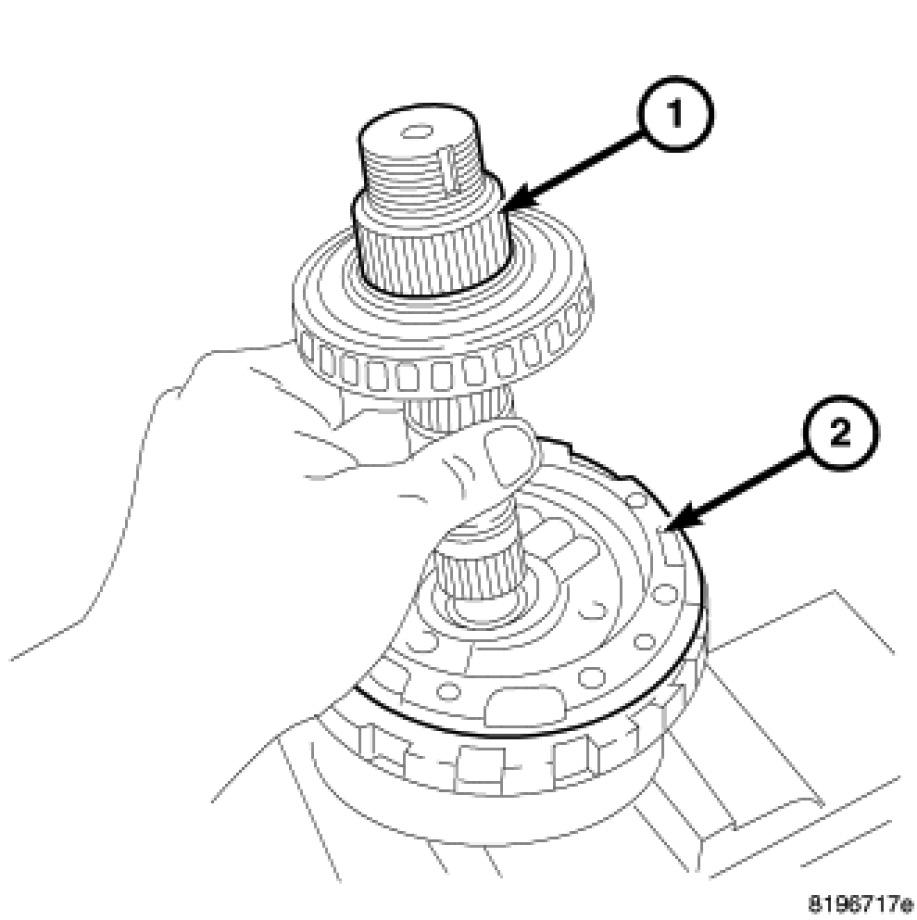 13. Install the transfer shaft (1) onto the low clutch (2).