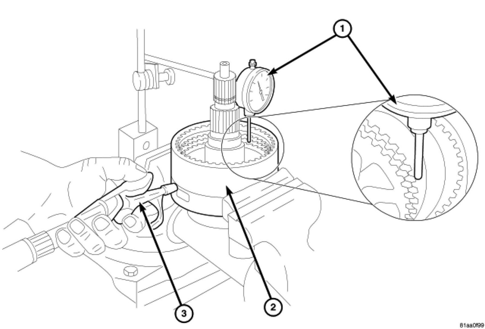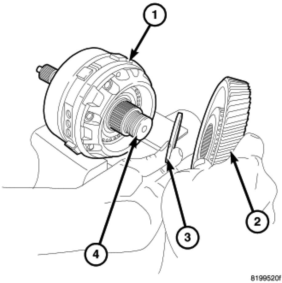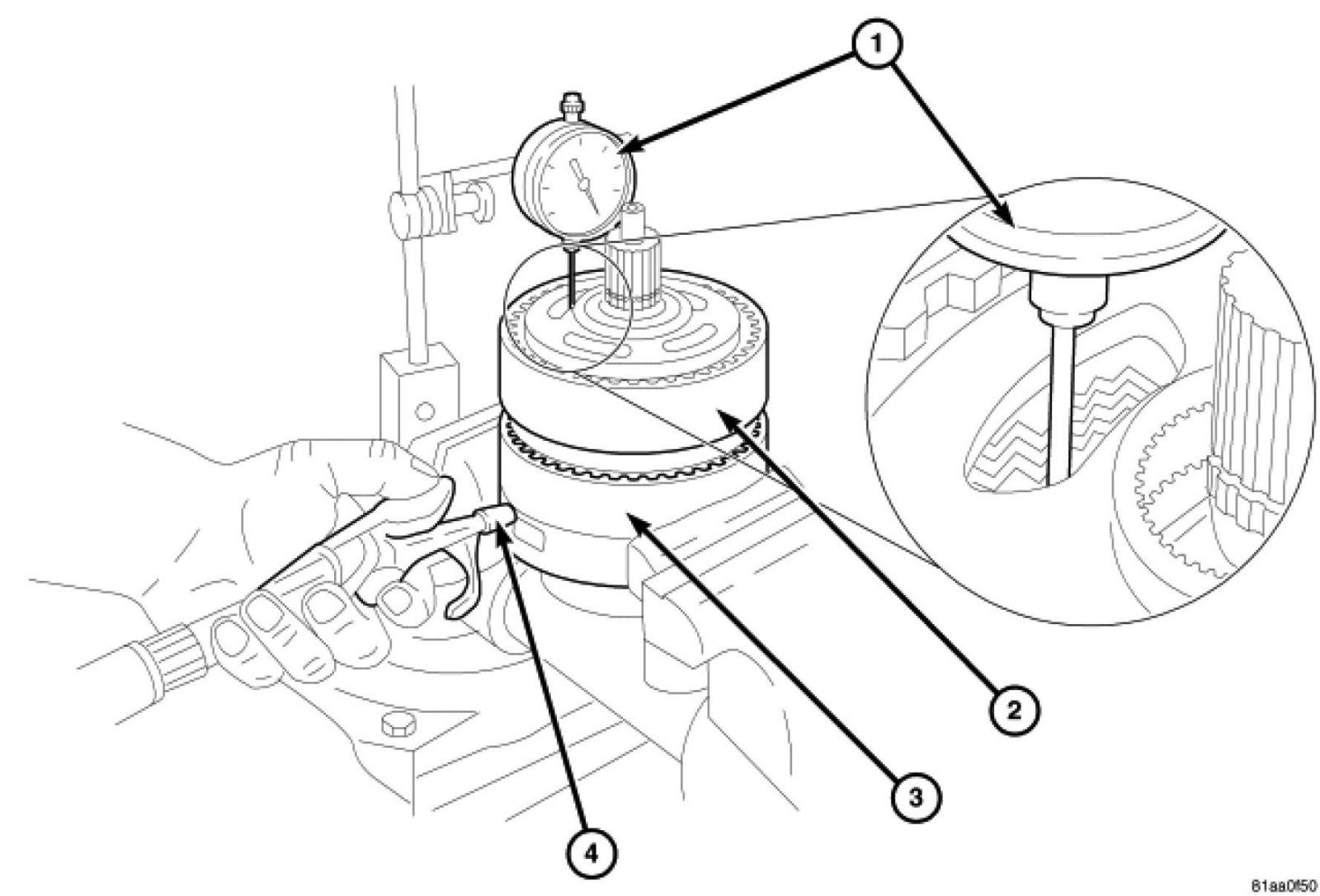 34. Using a Dial Indicator and air pressure measure the direct clutch clearance, the clearance should be 0.95 - 1.41 (0.037- 0.056 in). Install desired selectable reaction plate to achieve correct clearance.