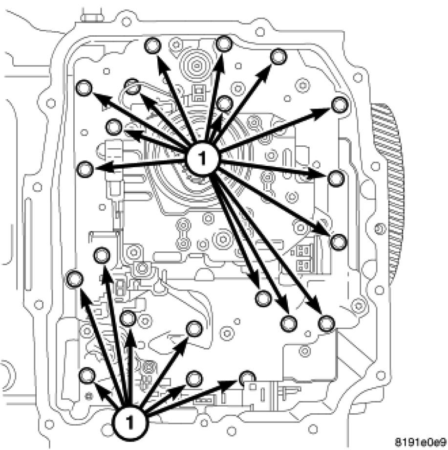106. Install the valve body bolts (1) and tighten to 7 Nm (50 in. lbs.).