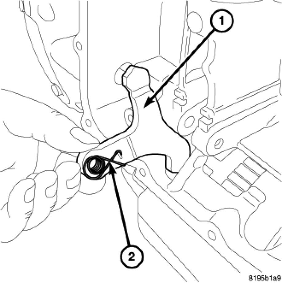 95. Install the park pawl tube (1) into case (2) making sure guide pin aligns with hole in case.