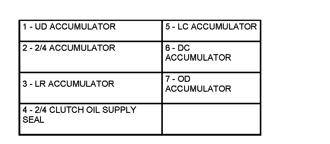 102. Install all six accumulators (1, 2, 3, 5, 6 and 7) into case along with the accumulator return springs.