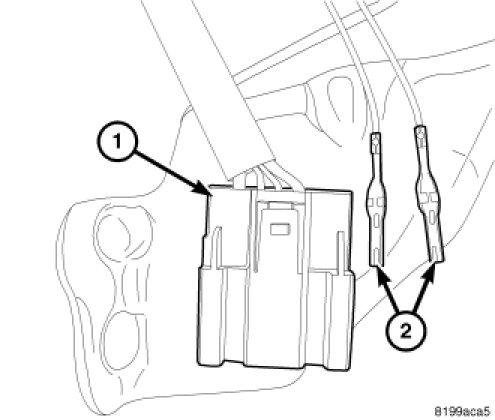 4. Insert the full open switch wire terminals (2) into the liftgate drive unit connector (1) ensuring the proper terminal location as noted in the full open switch removal procedure.