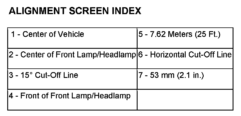 The low beam headlamp will project on the screen upper edge of the beam (cut-off) at the horizontal lamp centerline 50 mm ± (2 in.). Horizontal aim is preset and can not be adjusted. The high beam pattern should be correct when the low beams are aligned properly. To adjust headlamp vertical alignment, rotate adjustment screw to achieve the specified low beam cut-off location.