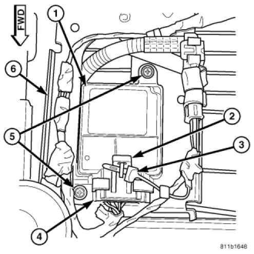 1. Carefully position the OCM (1) to the OCM bracket (6). When the OCM is correctly positioned, the connector (4) on the module will be pointed to right side of the vehicle.