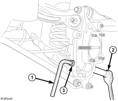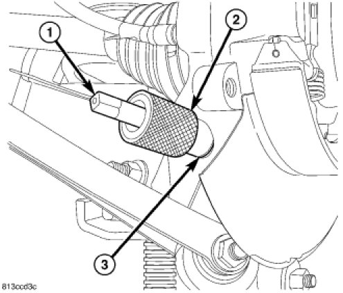 7. Remove sleeve retaining spring link ball joint (2) in knuckle (3) as follows: