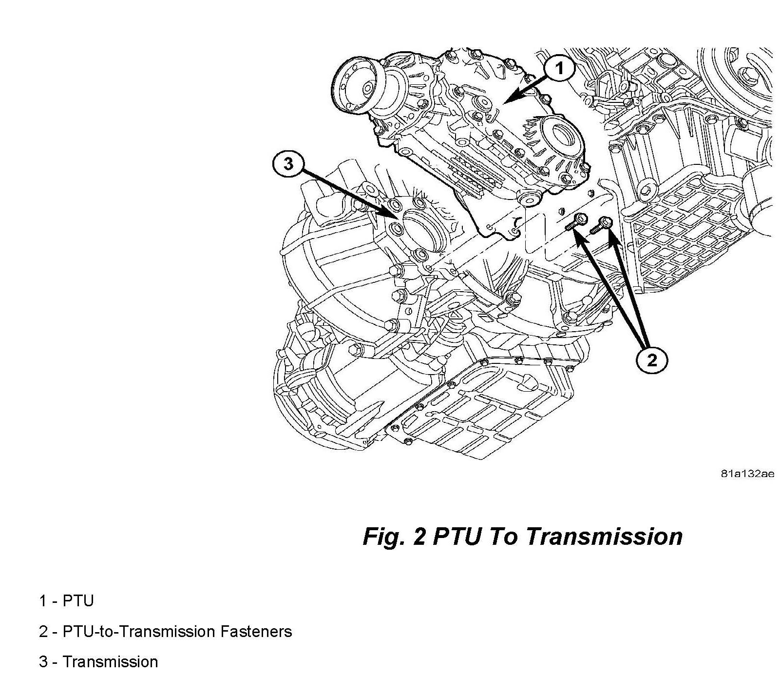 4. Install PTU into position. Install the PTU-to-transmission adaptor bolts and torque to 22 N.m (**16 ft.lbs.**) (Fig. 2).