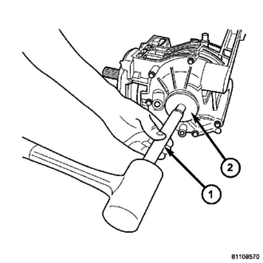 Install output flange seal to differential housing using handle C- 4171A (1) and installer 8493 (2).