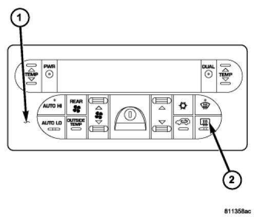 The electric backlight (EBL) system is controlled by a momentary push-button switch (2) located on the A/C-heater control (1) in the instrument panel. When the rear window defogger switch is pressed to ON, the integrated power module (IPM) energizes the rear window defogger (EBL) relay and battery current is then directed through the relay to the rear window defogger grid lines and the heated side view mirrors (when equipped). The grid lines heat the glass to help clear the rear window surface of fog or frost.