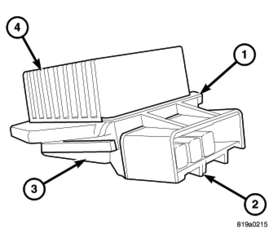 The blower motor power module is mounted to the bottom of the HVAC housing, on the passenger side of the vehicle. The blower motor power module consists of a molded plastic mounting plate (1) with an integral connector receptacle (2). Concealed behind the mounting plate is the power module electronic circuitry (3) and a finned aluminum heat sink (4). The blower motor power module is accessed for service from under the instrument panel.