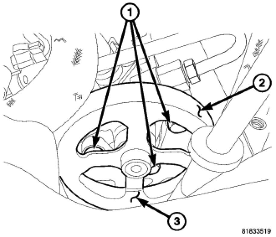 2. Place the pump in mounting position. Install the three bolts (1) through the pulley (3) openings. Tighten the mounting bolts (1) to 26 Nm (19 ft. lbs.).