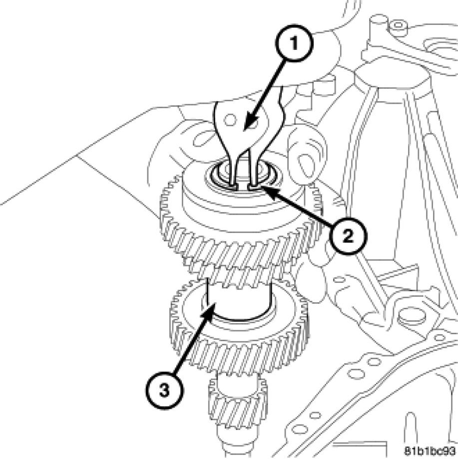 2. Install the new snap ring (2) that retains the input shaft bearing and third gear to the shaft.