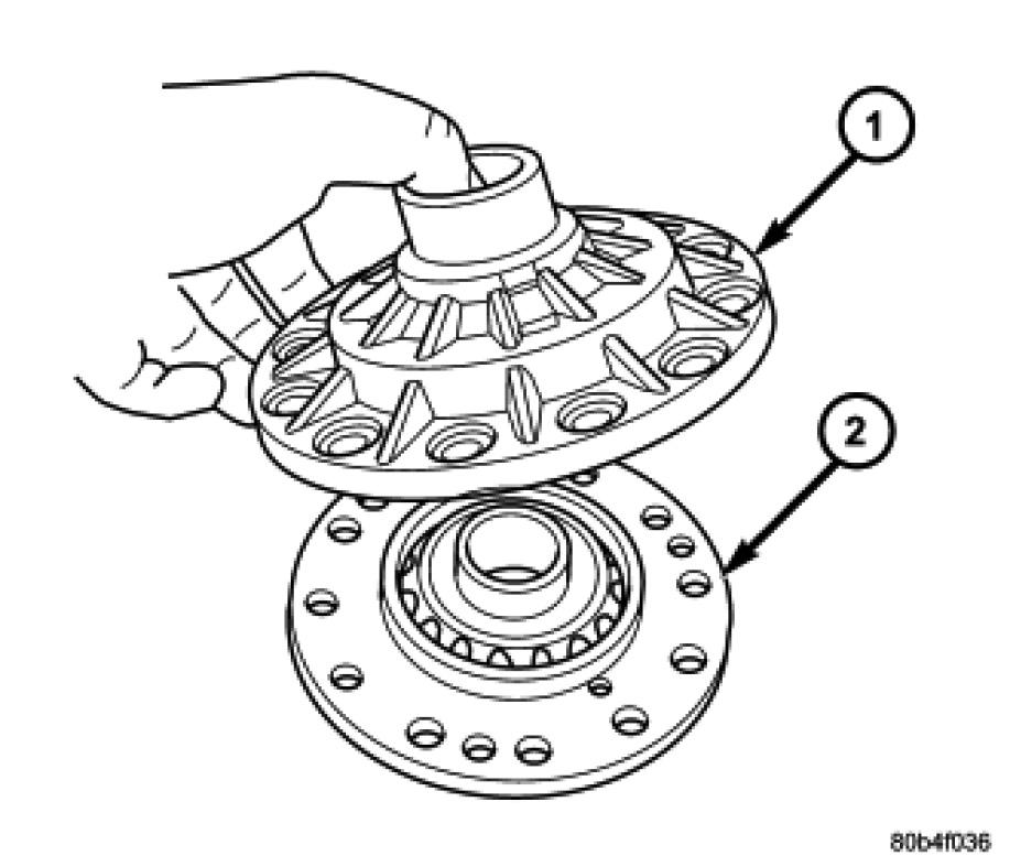 5. Install the side gear (2) and the thrust washer (1).