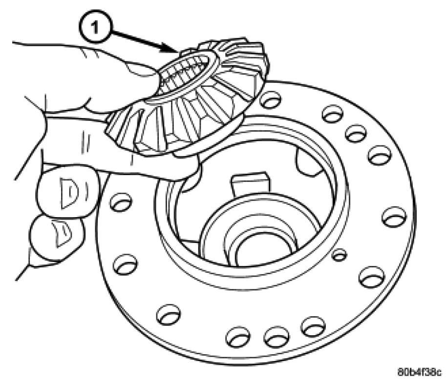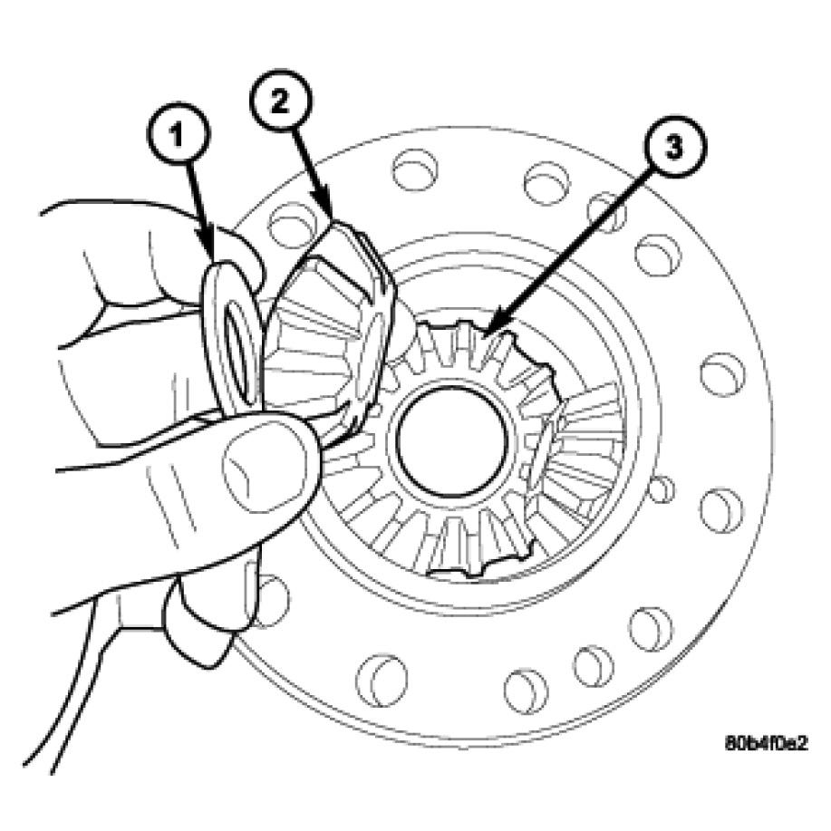 1. Install side gear thrust washer (1) into case.