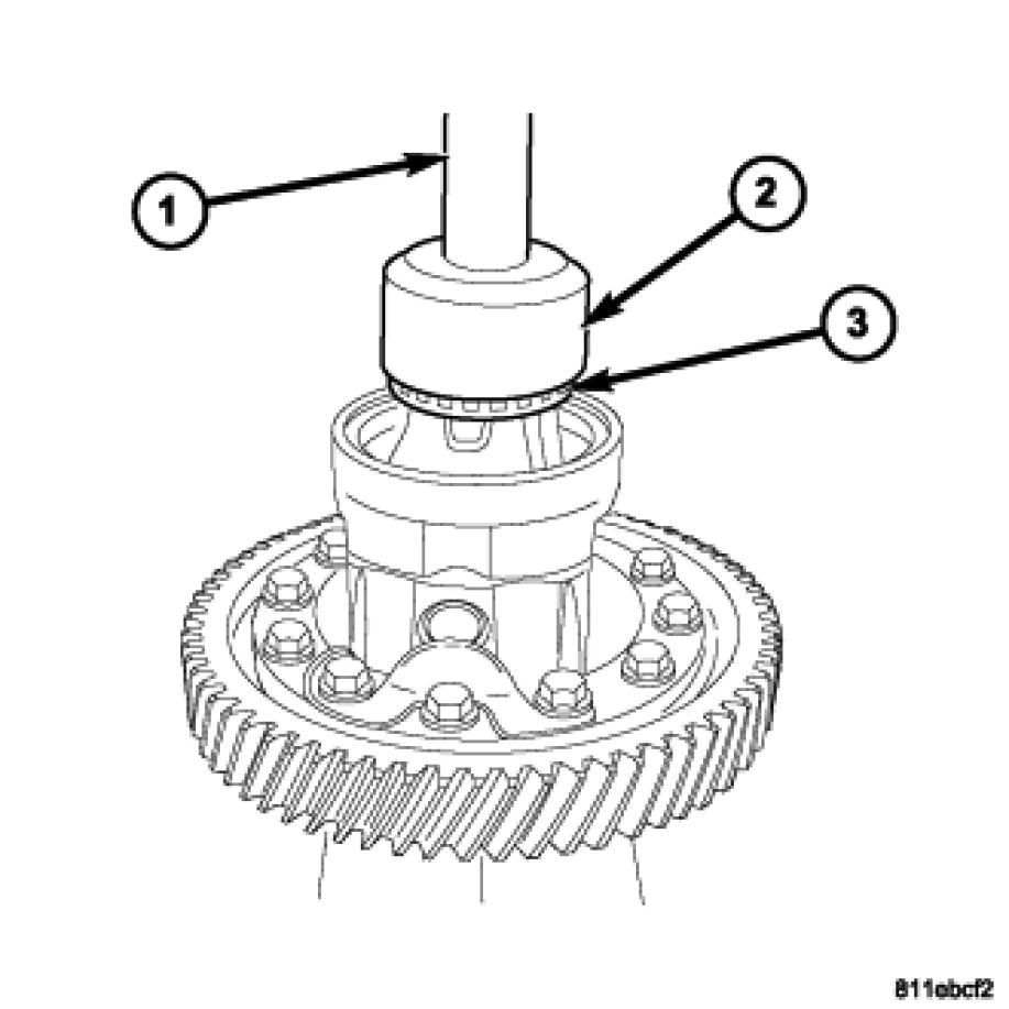 9. Using an arbor press, Handle C-4171 (1), and Installer L-4410 (2), install differential side bearings (3) to case side. If all wheel drive use Bearing Installer 6053 to install the large bearing.