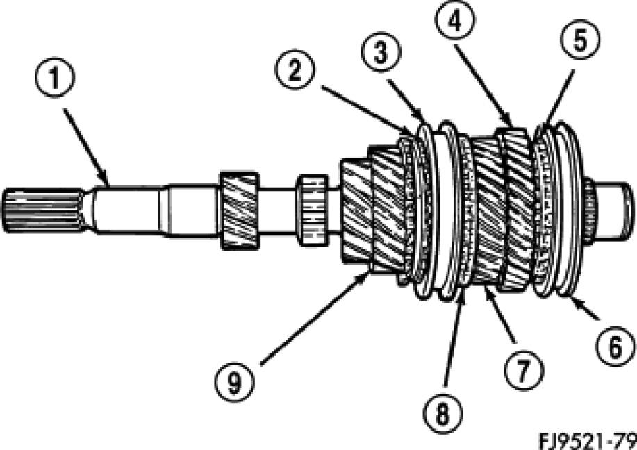 Before disassembly of the input shaft (1), it is necessary to check the synchronizer stop ring gap. Use a feeler gauge to measure the gaps between the stop rings (2, 5, and 8) and the speed gears. The correct gaps are listed below: