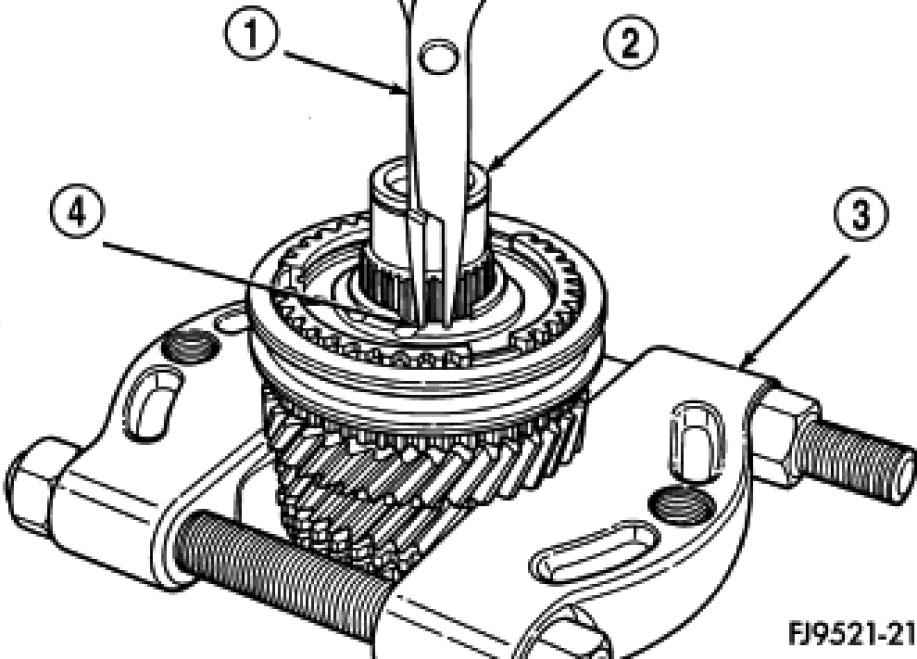 1. Install Bearing Splitter 1130 (3) behind 5th speed gear. Remove snap ring (4) at 5th synchronizer hub on input shaft (2).
