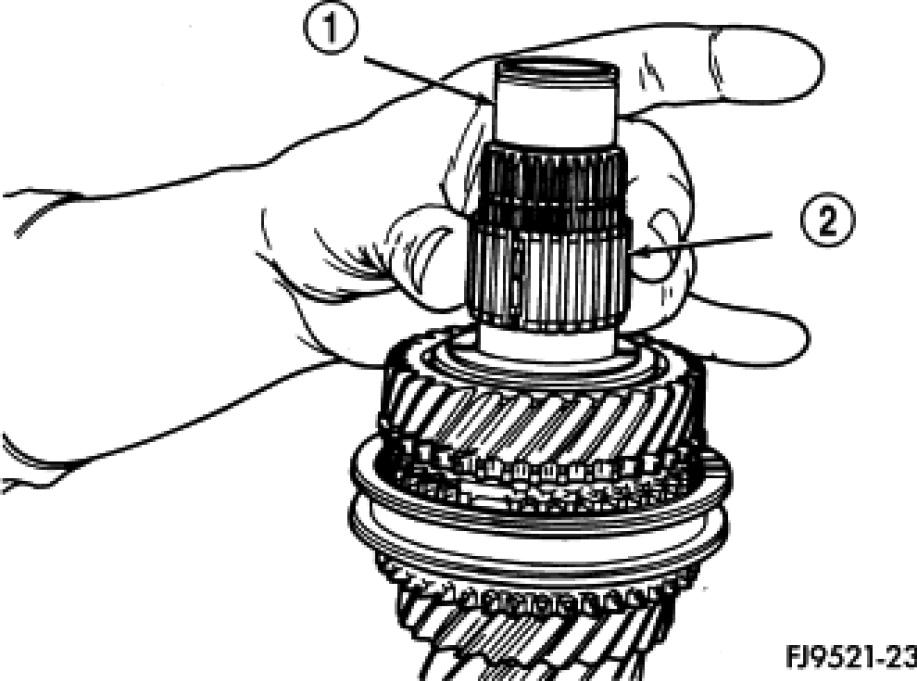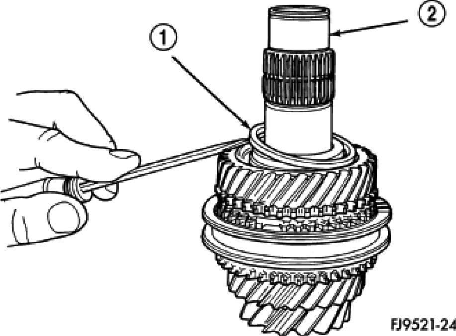 8. Remove 4th gear caged needle bearing (2). Check the caged needle bearing (2) for a broken retention spring.