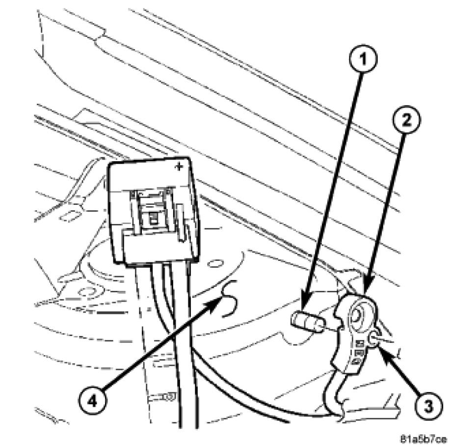6. Remove the lower battery tray support bolt (4). Loosen the upper support bolt and allow the support (1) to swing down out of the way.