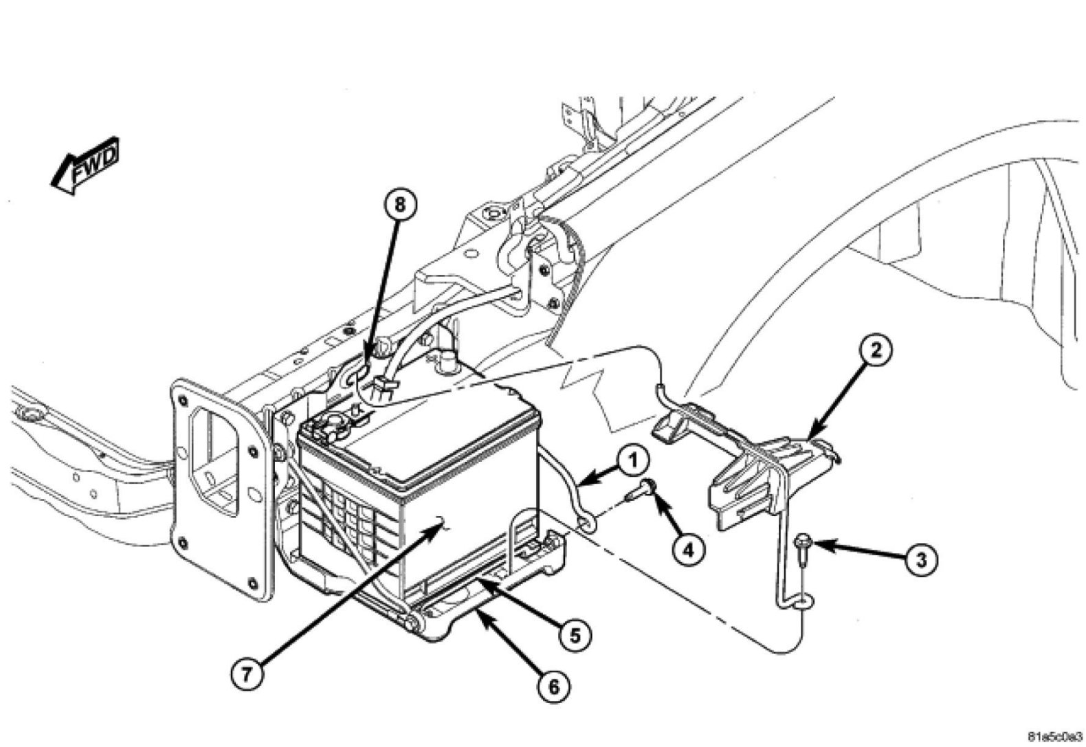 8. Rotate the battery hold down rod rearward and disengage it from the mounting slot in the battery tray (8). Remove the battery hold down (2).