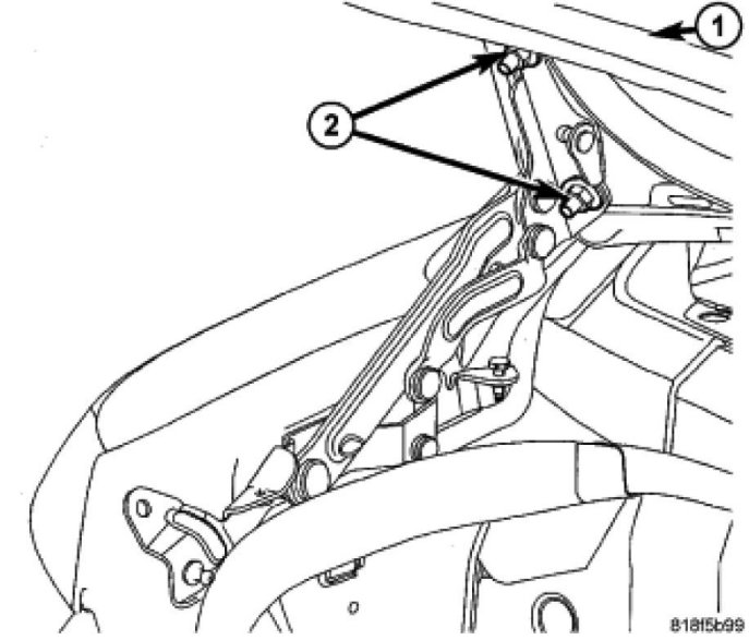 5. With aid of a helper, remove nuts (2) attaching decklid (1) to decklid hinge.