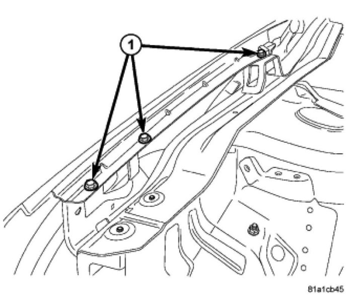 2. From inside engine compartment, start the center upper rail bolt. Install all the fasteners (1) attaching fender to upper rail and tighten.