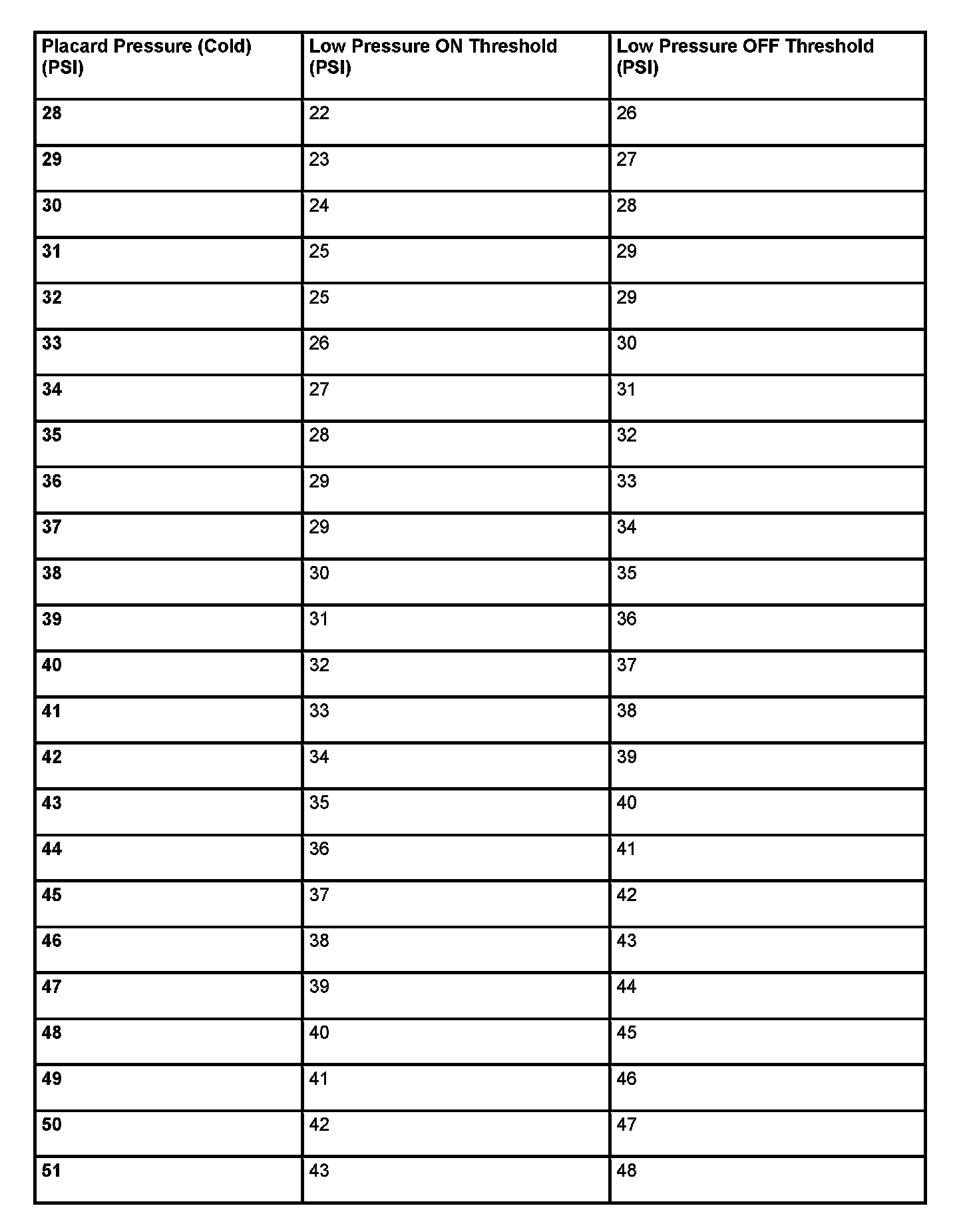 For both the premium and base TPM, the recommended "Placard Pressure", "Low-pressure Threshold" and "Hysteresis Pressure Values" for the tires installed on the vehicle, are stored in the WCM non-volatile memory during the initial Manufacturing Plant Process, or during a service procedure, as required. To determine the pressure thresholds for a vehicle, refer to the Tire Inflation Pressure (Placard) Label, and then apply the placard pressure to the following table. The Low Pressure OFF Threshold is defined as the Low Pressure ON Threshold plus the Hysteresis Pressure Value.