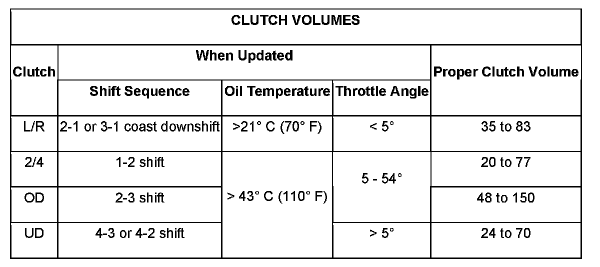 Certain mechanical problems within the clutch assemblies (broken return springs, out of position snap rings, excessive clutch pack clearance, improper assembly, etc.) can cause inadequate or out-of-range clutch volumes. Also, defective Input/Output Speed Sensors and wiring can cause these conditions. The following chart identifies the appropriate clutch volumes and when they are monitored/updated: