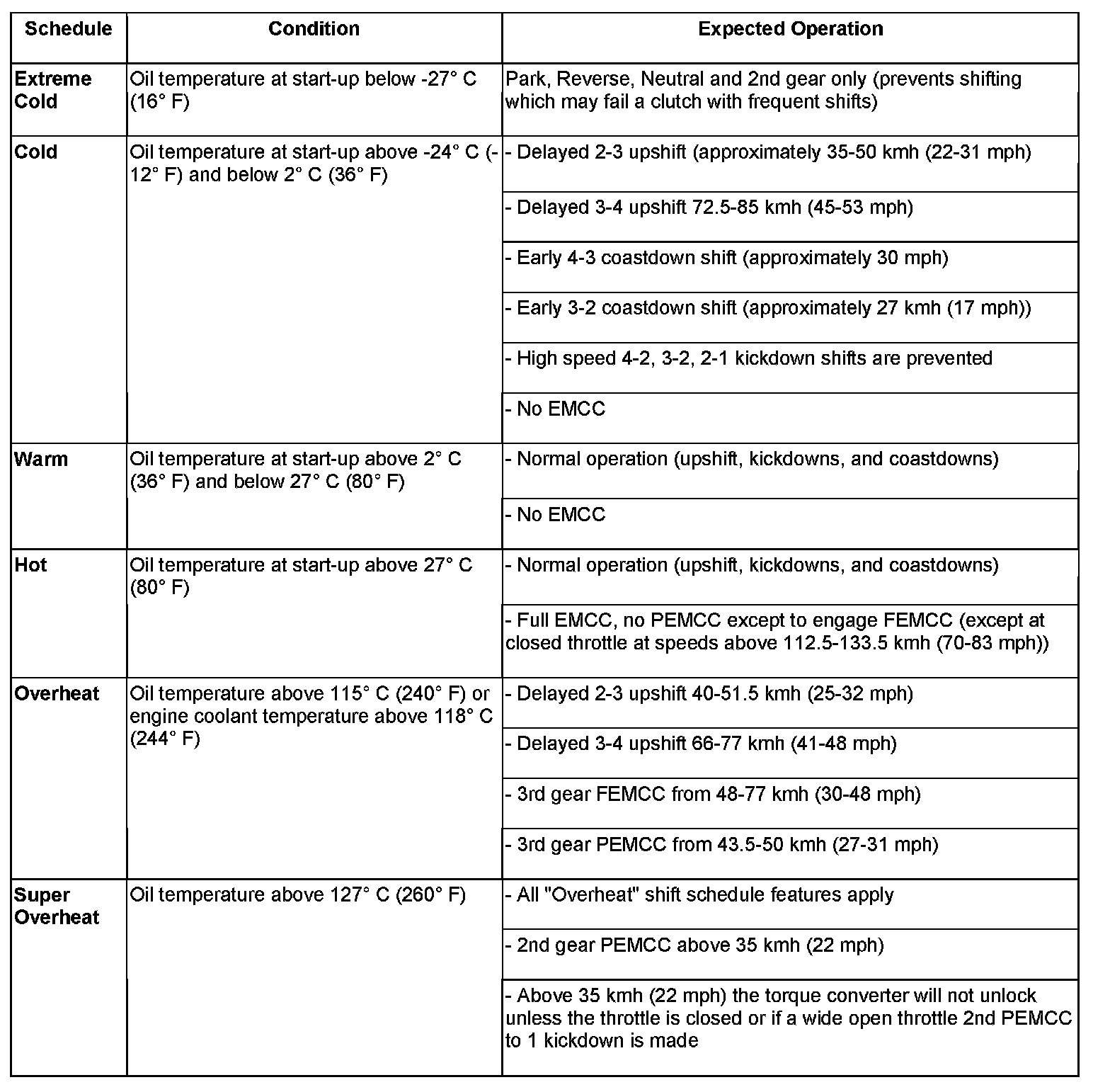 As driving conditions change, the PCM appropriately adjusts the shift schedule. Refer to the following chart to determine the appropriate operation expected, depending on driving conditions.