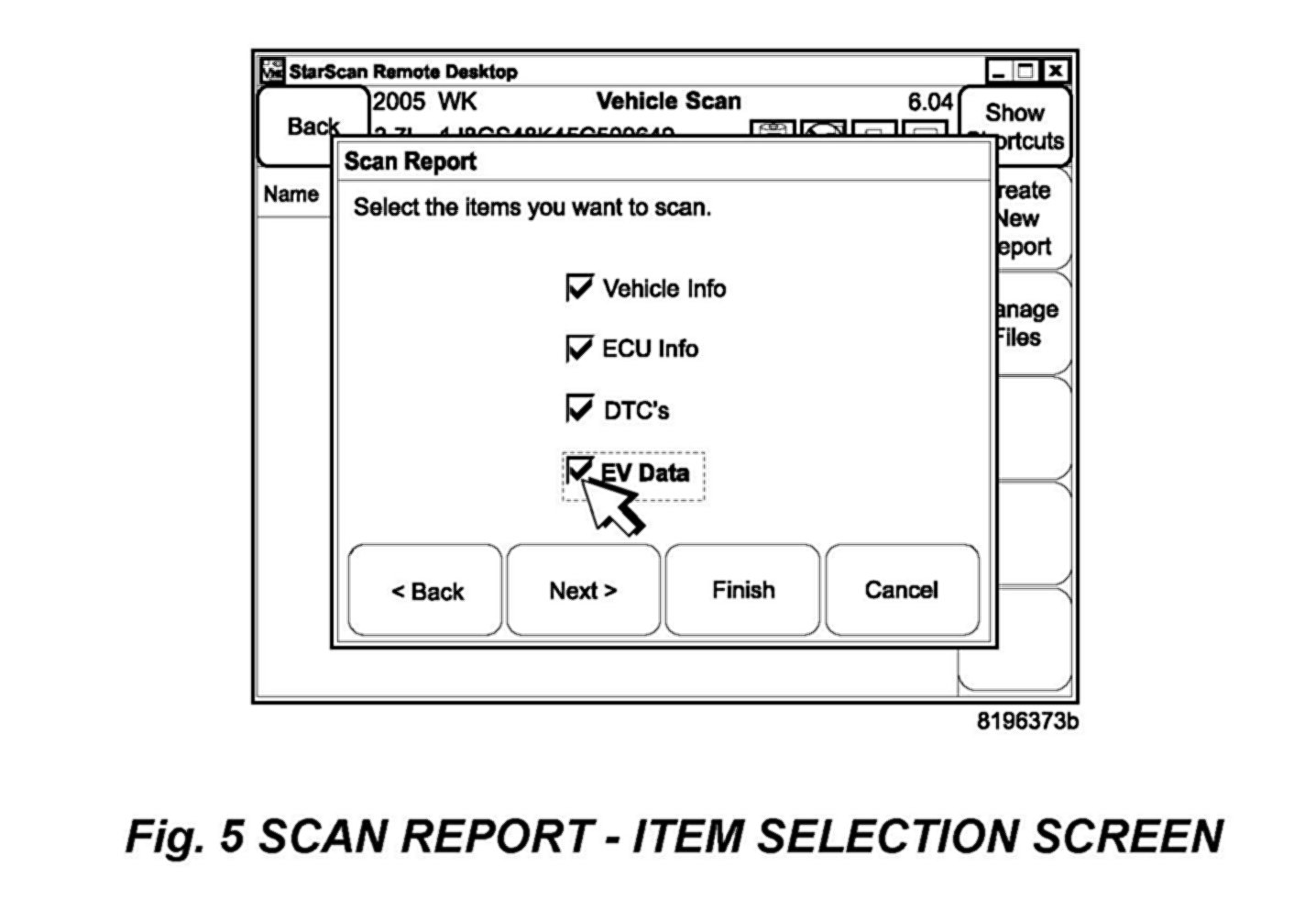 6. A "Scan Report" dialogue screen appears providing options of adding additional information to the report. In this example we checked "Vehicle Info", "ECU Info", "DTC's and "EV Data" (Fig. 5).