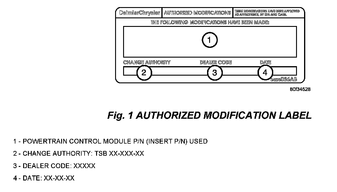10. Type the necessary information on the "Authorized Modification Label p/n 04275086AB and attach near the VECI label (Fig 1).